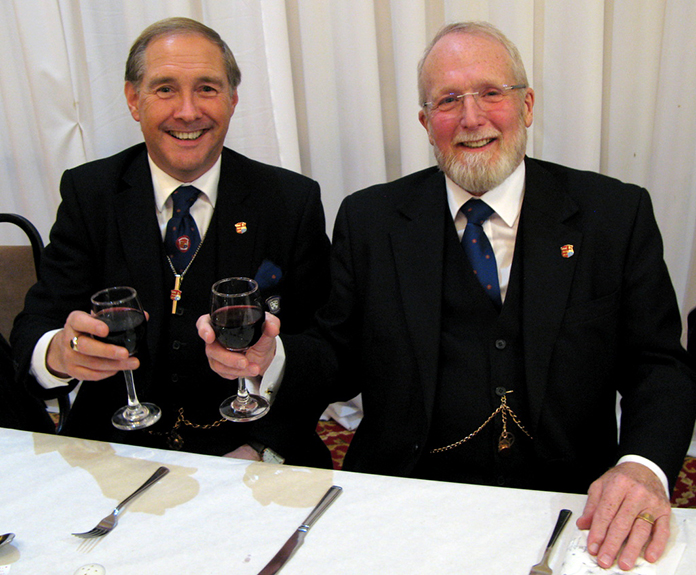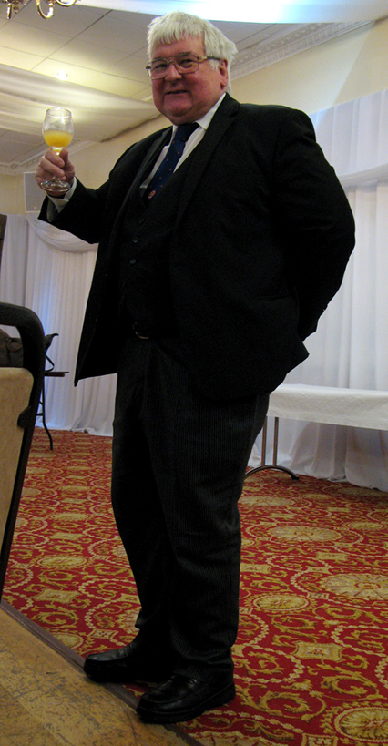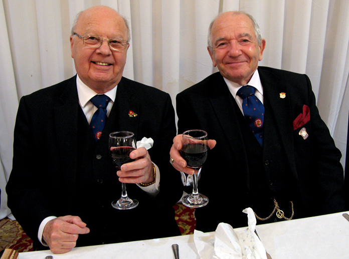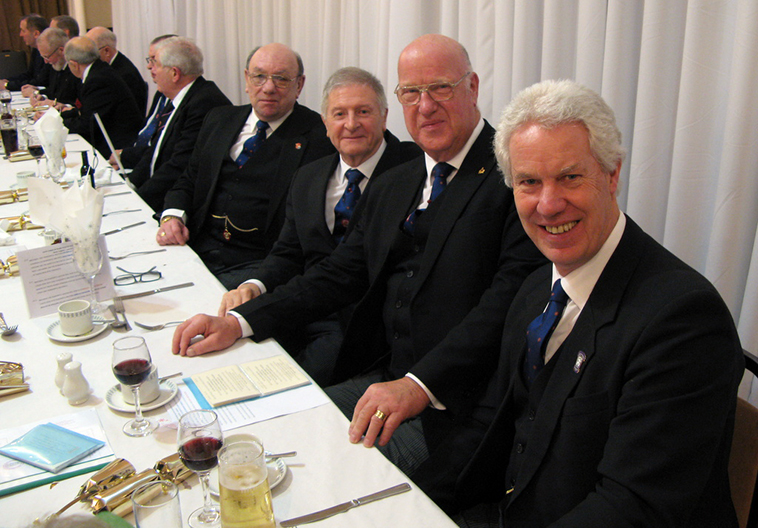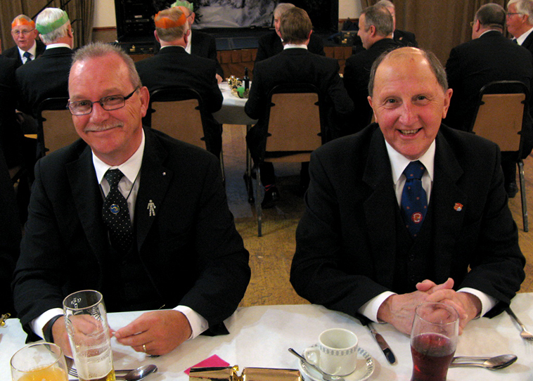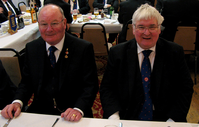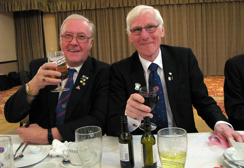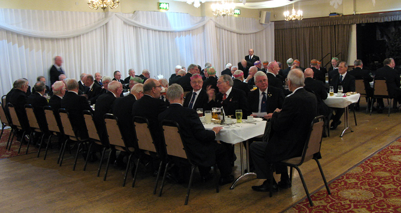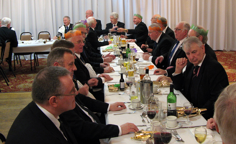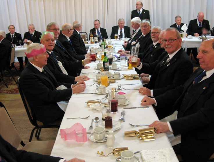 | An excellent meal was served up by the friendly efficient staff including my salad (still on a diet), I must admit I did have a couple of the mince pies, they will be my downfall. Following on from the meal the usual Toasts and responses were given, all of which were on this occasion light hearted, the Asst PGM Giles Berkley PGStwd had some great humour and the other Asst PGM Ian Nairn PGJO was stand up comedian quality and yes our PGM joined in with a joke (a new joke) in his response which was very funny, yes very funny. |