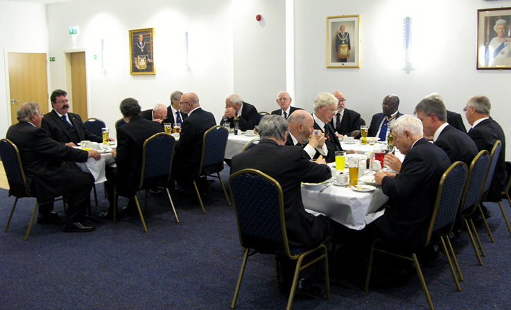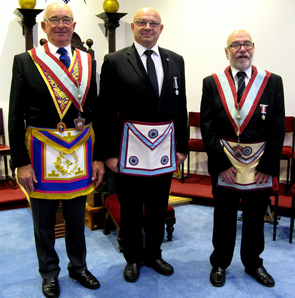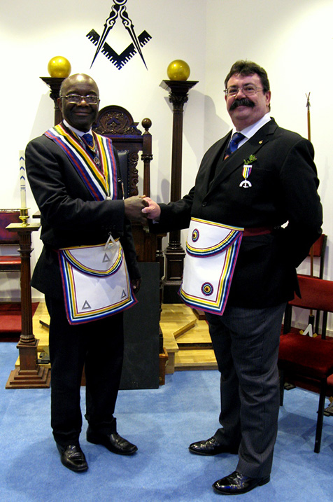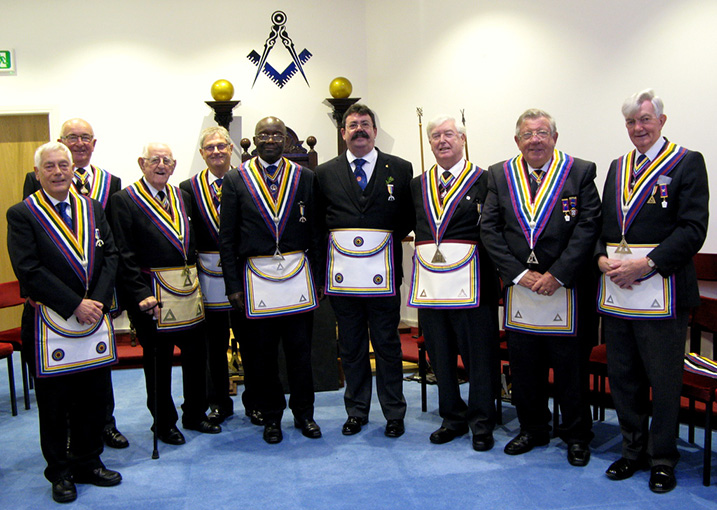 | The RAM meeting tyled on time at 4.30 pm and following some general lodge business items, Bro. Nigel Frederick Paton a member of Cloister Mark Lodge No.1475 was duly admitted and elevated by the W.Commander Bro.Sylvester During and his officers in an excellent ceremony which I’m sure Nigel will long remember. Before we had time to take a breath the Mark Meeting was duly tyled at 6pm, which included the newly made member of the RAM Nigel, Bro. Daren Lee Gregory a member of Davyhulme Craft Lodge No.3715 was duly elevated to a Mark Master Mason by Worshipful Master Malcolm Jacobs and his officers in yet another excellent Ceremony, whew, I got the feeling that every one present was now ready for some liquid refreshments. |