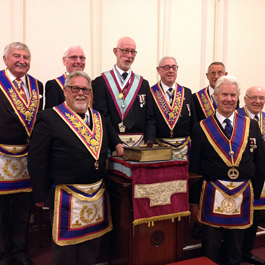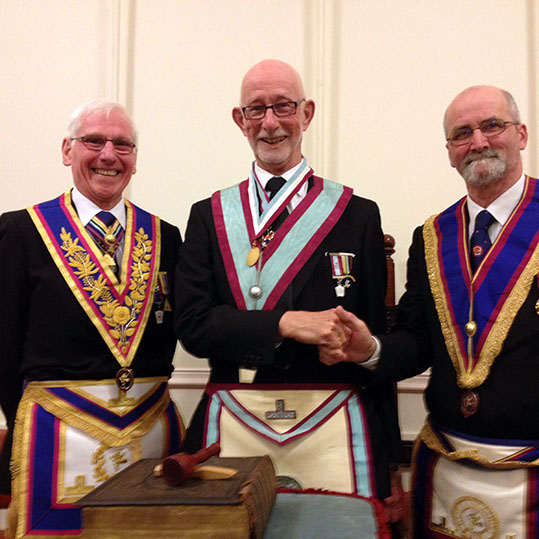 | After taking his rightful place in the Lodge, the WM proceeded  to installed Bro. Keith Wilson into the Chair of Adoniram.  During the ceremony the Installing WM was  assisted by the following brethren: Presentation of the Working Tools - W.Bro. Brian Skinner, PGStdB Presentation of the Keystone and Charity Jewels – W.Bro. Terry Tasker, PProvGSD Address to the WM - W.Bro. John Dixon, PGJD Address to the Wardens – W.Bro. Kevin Chicken, PProvGReg Address to the Overseers – W.Bro. Jim Grant, PProvGJW Address to the Brethren – W.Bro. John Bicknell, PGJD |