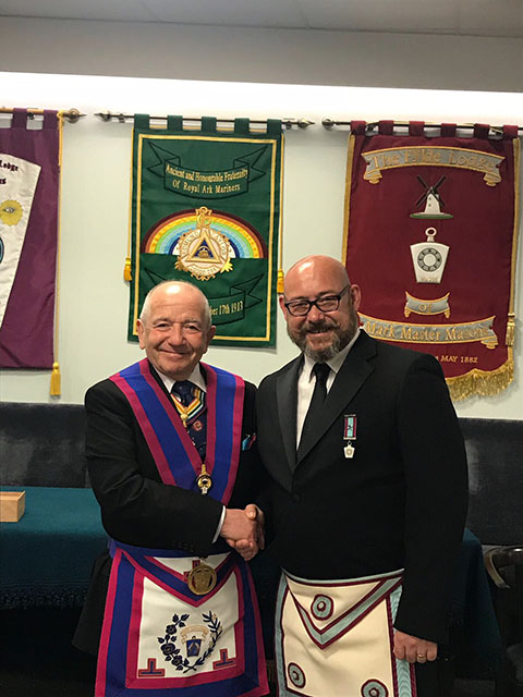 | At the conclusion of the ceremony in front of 33 Mark Masons the Rt W Provincial Grand Master welcomed Bro Callaghan to The Fylde Lodge MMM wishing him a long and happy association with the Lodge and the Mark Degree. |