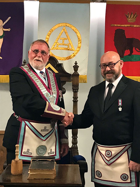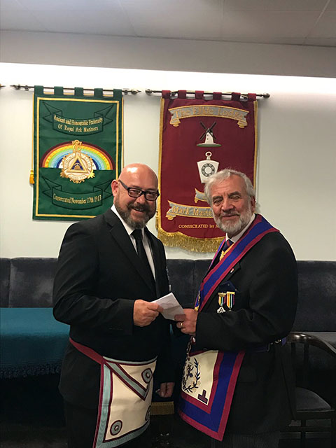 | W. Bro John Forster then presented the letter of welcome to Bro Callaghan, telling him to keep the discount voucher safe as it could not be used until PGL next year! |
