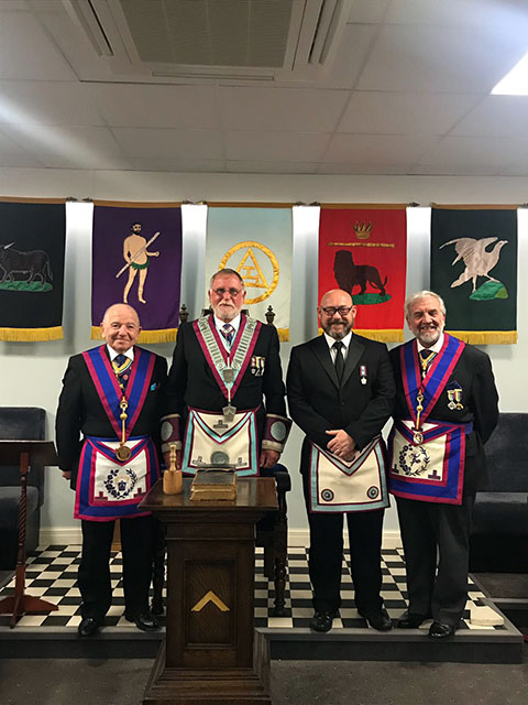 | Bro. Neil Callaghan, Secretary, W. Bro Ricky Clarke's candidate was advanced in fine style by Worshipful Master Bro Brian Ogden assisted by W. Bro John Forster (Signs), W Bro Peter Green (Charges after being invested) and Bro Brian Purdie (tools). |