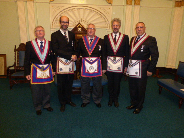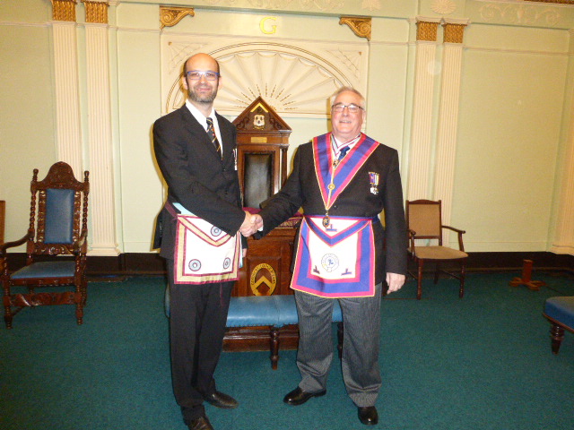 | This was Bro Boyle’s first Advancement ceremony acting as Senior Deacon and he did a fine job. (Roger had big shoes to fill; for when Roger was advanced the Senior Deacon on the night had been RWBro Peter Connolly PProvGM. The overseers for the night were WBro Tom Marlow PProvGJW as Master Overseer accompanied by two guests WBro Steve Walls PAGDC and WBro Alan Foster PProv GSW taking the Senior and Junior overseers offices respectively. |