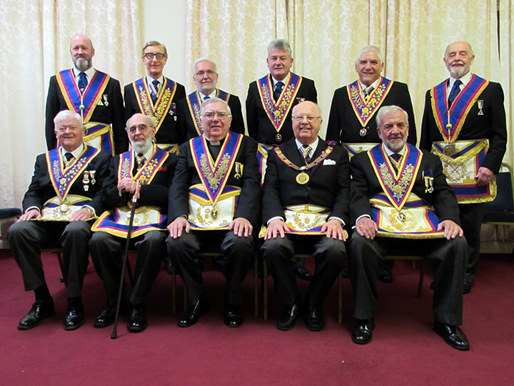 | The Worshipful Master appointed and invested his officers for the ensuing year, the Wardens were addressed by W.Bro. Forster, the Overseers by W.Bro. Haynes and the Installation Ceremony was brought to a close with the Address to the Brethren by V.W.Bro. Lee who then congratulated W.Bro. Gitsham on him attaining the chair of Imperial Lodge for a second time and wished the Lodge well for the future. On behalf of all the Grand Lodge Officers present W.Bro. Forster gave greeting and he too wished the Lodge well. V.W.Bro. Lee along with the Grand Officers retired from the Lodge and waited in an ante room whilst the Worshipful Master closed the Lodge. A quick photo-shoot took place before repairing to the bar area for an aperitif before taking our seats in the dining room. |