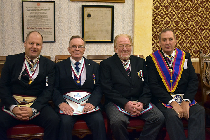 | The Worshipful Masters of five other Mark lodges were in attendance. John Parrott of Furness No 36, Paul Thompson of Garnett No 146, Martin Swarbrick of Scorton No 1103, David Robinson of Preston No 143 and local representative Stuart Brackstone who is in the chair of Unity Lodge No 544. |