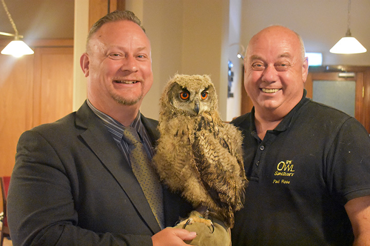 | Paul is a retired head of security at the local shipyard. Since retirement he has run a rescue centre for birds of the strigiform order – or more commonly owls. Paul didn’t bring along one of his charges on the night – it would have looked too much like Hogwarts and requires an easily cleanable floor surface! – But attached is a photograph from a charity evening at Barrow Masonic Hall when Paul took along some of his owls. |