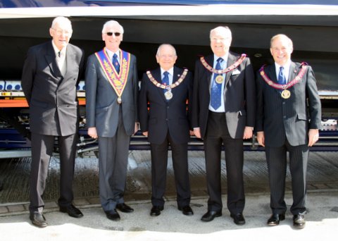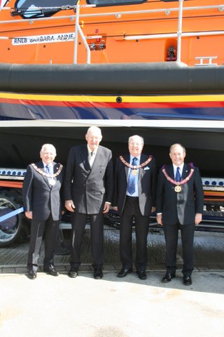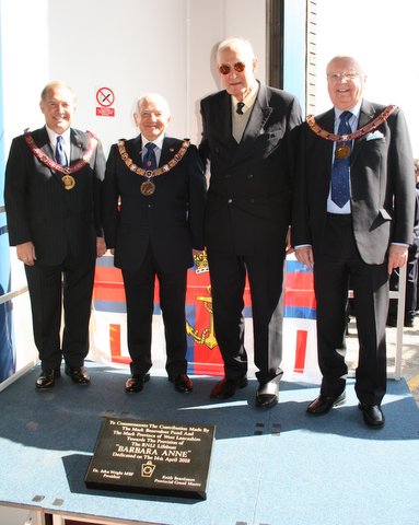 | After the Local Town Crier had called the gathered crowd to order, the chairman of the Lytham St. Annes Lifeboat Station welcomed the guests. Inside the Station was the President of the Mark Benevolent Fund, Right Worshipful Brother Dr. John Wright Past Grand Senior Warden together with the Right Worshipful Provincial Grand Master, the Deputy and Assistant Provincial Grand Masters, the Provincial Grand Secretary and the Provincial Charity Steward with their wives and other guests. Outside the Station among the many gathered there were many Mark Masons. |