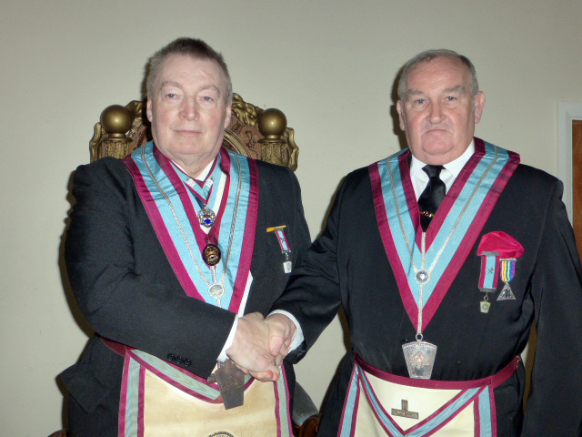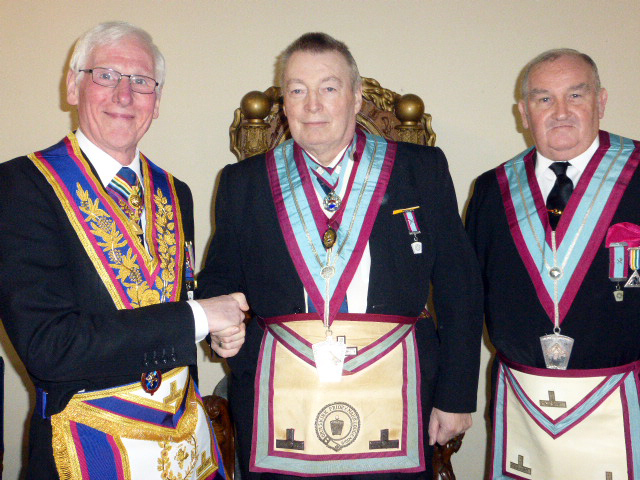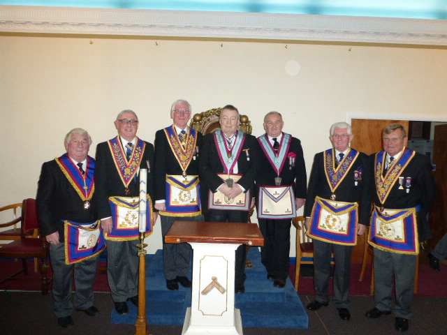 | With the greetings and salutations out of the way the Worshipful Master WBro James Roberts asked WBro Graham Radford, PProvGSD to occupy the Senior Wardens Chair, and WBro Ian Kennedy, PProv GJO to remain as Junior Warden and WBro Bill Cropper, PGJD to stay as Inner Guard. WBro Alan Burgess PProv AGDC then presented Bro Tony Prior Master Elect to the Worshipful Master for the benefit of Installation. WBro Roberts then steadily worked his way through the ceremony of installation and placed Bro Prior in the chair. (It was a special thrill for me to see Tony going into the Mark Chair, as I had done his third degree ceremony as visiting master for the Lombardian Craft lodge at Ormskirk several years ago). |