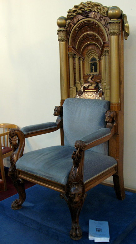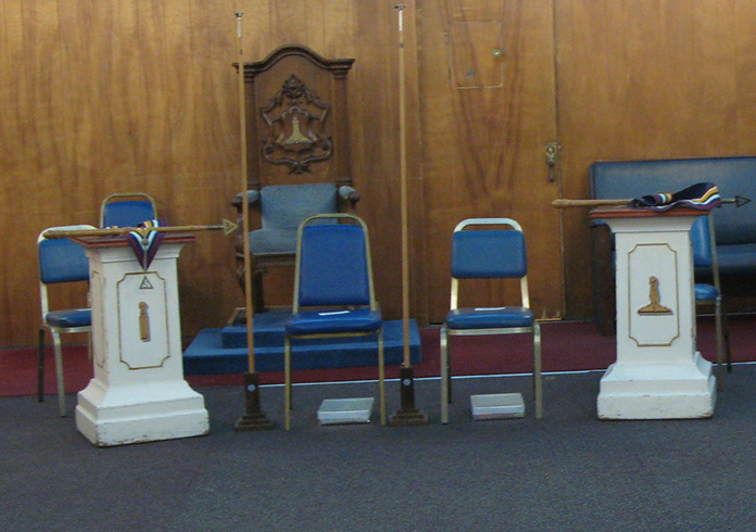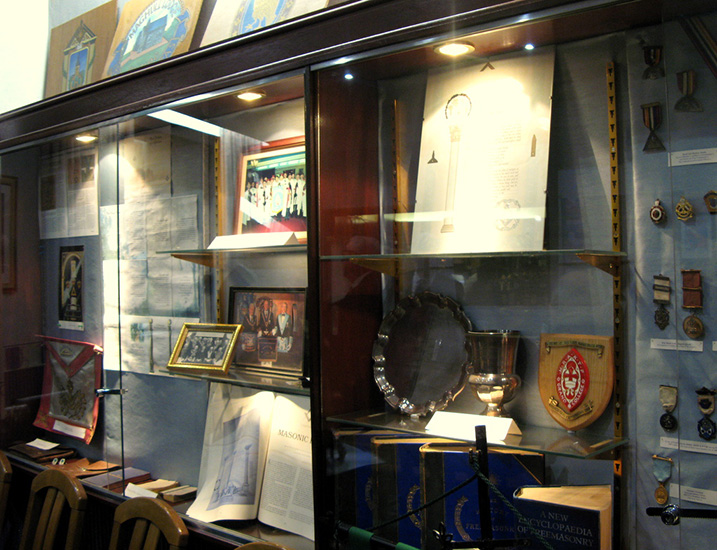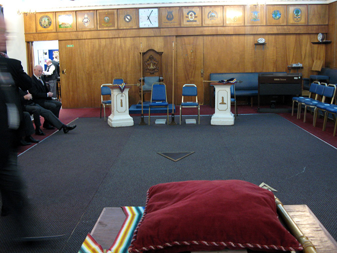 | The Hall isn’t the easiest to find unless you have been before, all you have to do is look out for is O’Briens Tea Rooms and you’ve cracked it, walk past it to the left, turn right at the next road and the entrance is there on your right. Once inside straight ahead is the Tea Room which is used for the Lodge Festive Boards, climb a flight of stairs you will find a welcoming bar, turn left and you’re in a snug room with some great artefacts on display, there is also a dressing room attached and if you head straight forward from the stairs you enter the very well maintained, good sized and pleasant Lodge room. |