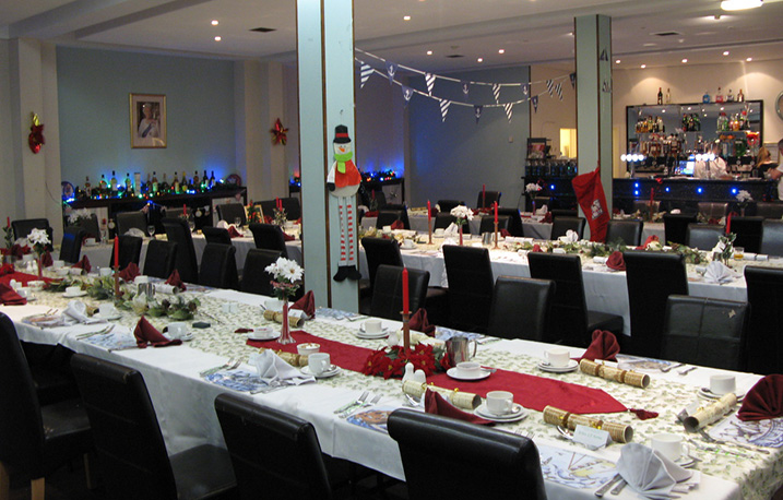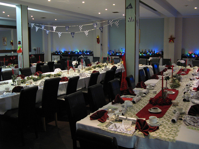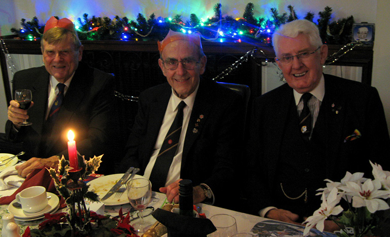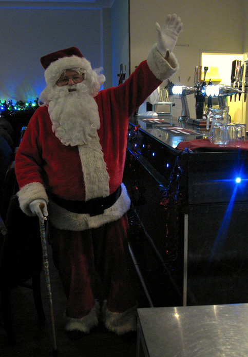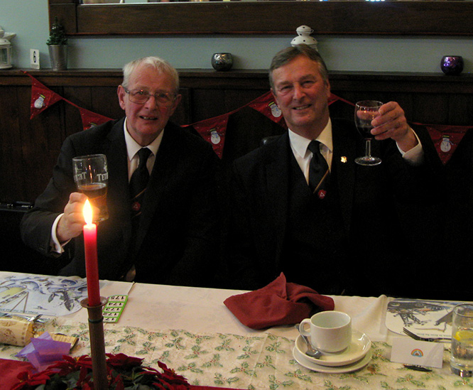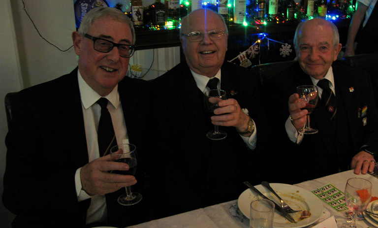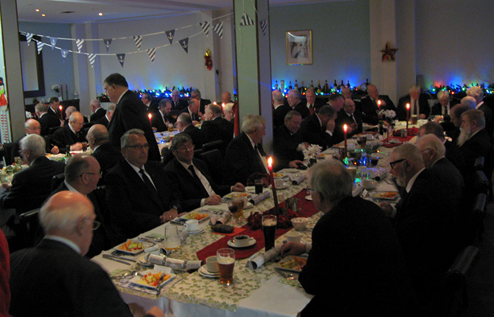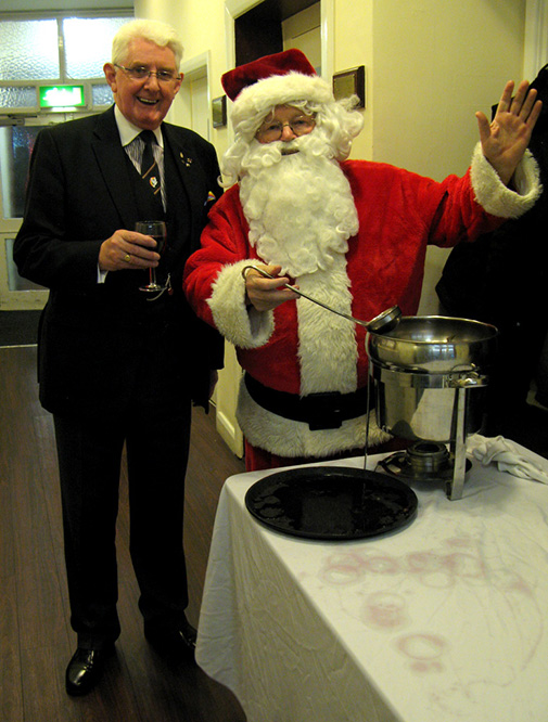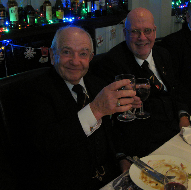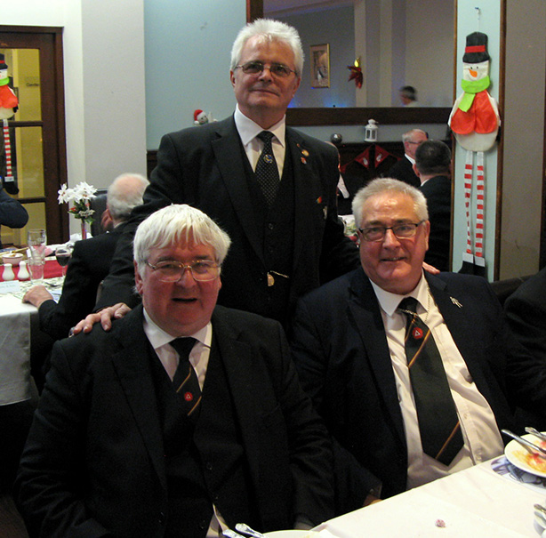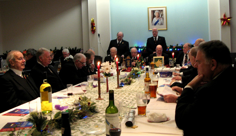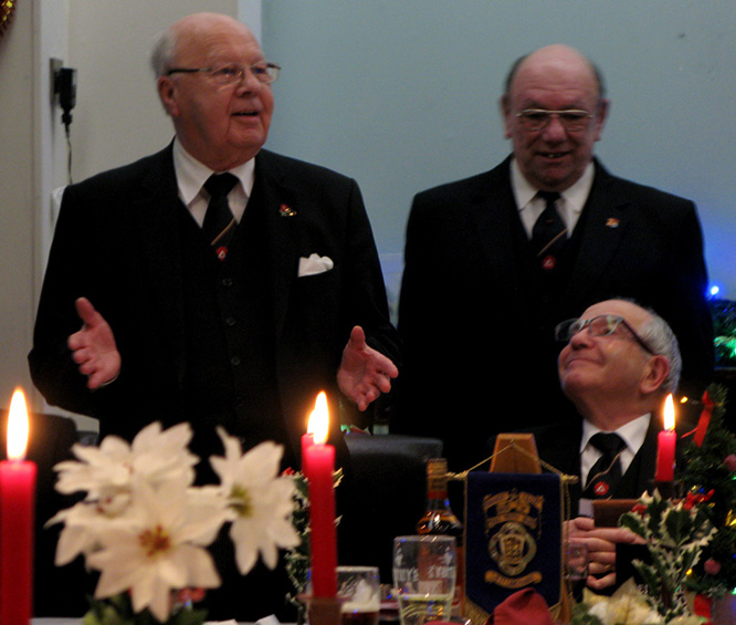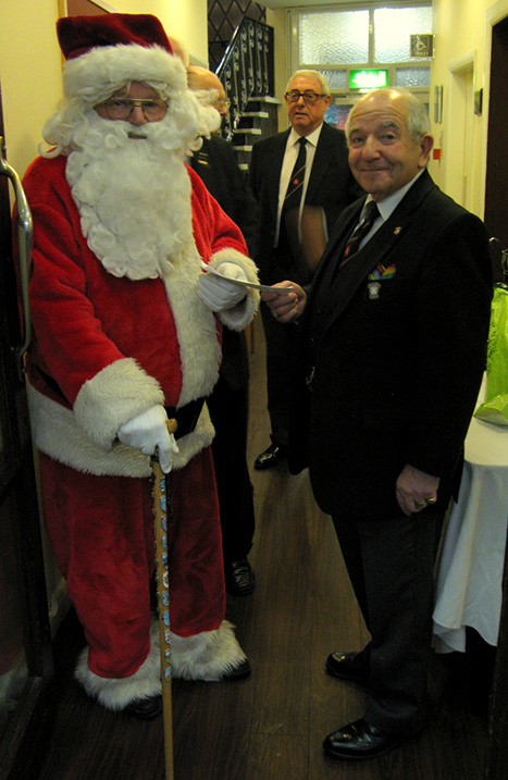| Following the Ceremony of Elevation the PGM retired from the Lodge accompanied by members of his team and on closing the meeting time was taken for the usual photo shoot before everyone made their way down stairs to be greeted by Santa offering some warm mulled wine which was delicious, some well earned liquid refreshment was then obtained from the well stocked bar before taking up the allotted places at the Festive Board tables which looked absolutely wonderful set out in true Christmas style. An absolutely First class meal was served up by the very friendly and efficient members of the catering team, the PGM made comment that he must put this meeting on his calendar for next year as he enjoyed it so much. |