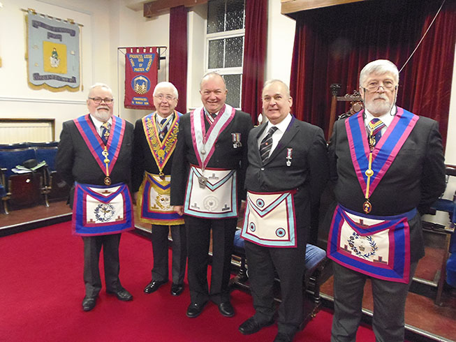 | W.Bro's R. Kinder PGJD, A. Baker PGStB, R. Thompson WM, |