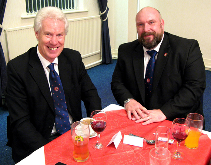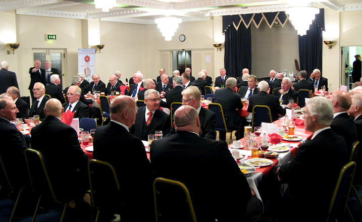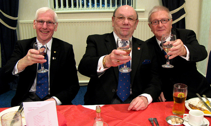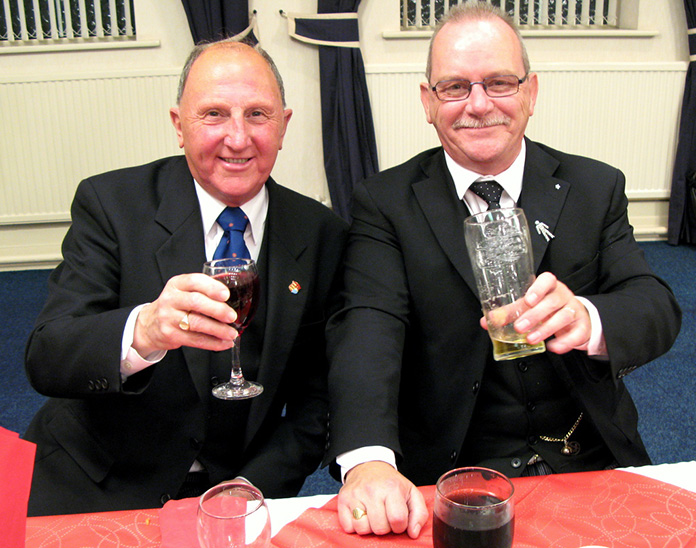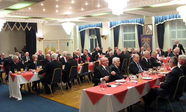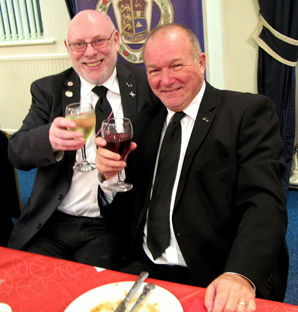 | The PGM congratulated the newly Installed WM and all the officers who had taken part in the Ceremony then it was time for him to retire along with the Acting Grand and Prov Grand Officers, as soon as the Lodge meeting drew to a close everyone returned for a quick photo shoot then it was off to the bar from some liquid refreshment. He who must be obeyed Prov DC W.Bro.Dave Emmerson soon called for everyone to take up their allotted seats in the dining room where an excellant meal was served up by the very efficient and friendly Hall staff. |