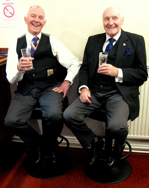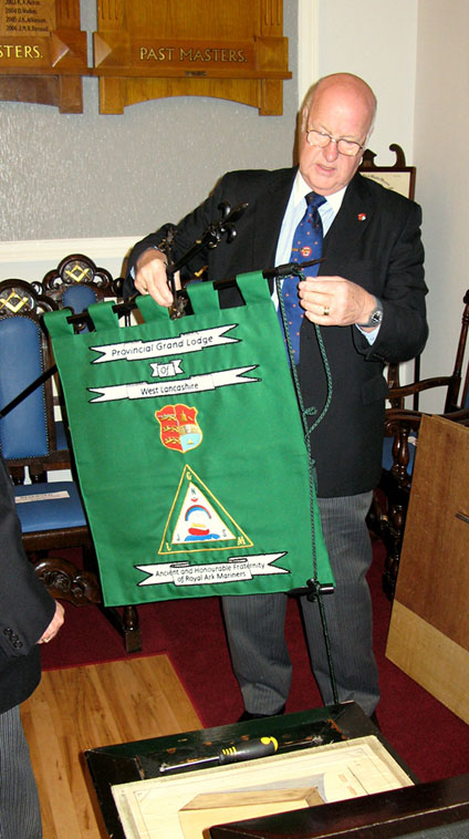 | The working tools of the Degree were presented and explained by the SW Bro. Askew (in excellent style), the PGM congratulated the new Mark Mason and all the officers who had taken part in the ceremony, the WM was pleased to present Keith with a cheque for the West Lancs Mark Charities which was gratefully received. Now the PGM handed over to his Special Representative VW Bro. Eric Drinkwater PGJO who read out the details of a letter which is now presented to all new members as an introduction to the Mark Degree in West Lancashire including the special price for his meal at the Provincial Meeting on the 1st May next year, his introduction wouldn’t have been complete without also passing him that little blue book, “Mark Ritual” No.1. It was now time for the PGM, members of the Prov Team and other distinguished officers to retire, (no not to rush off to the bar because they patiently wait outside to re-enter on the Lodge on closing for a short photo session to the record the evening for posterity) once that was completed it was time to get some liquid refreshment and share plenty of stories from around the Province before taking up their seats at the Festive Board. |