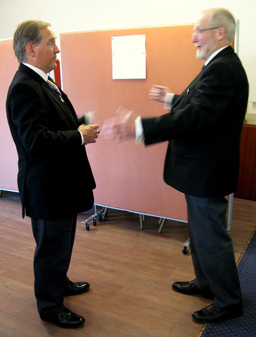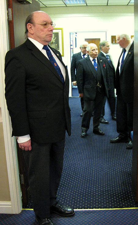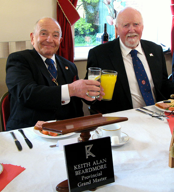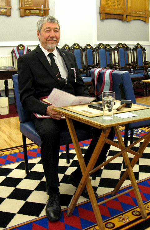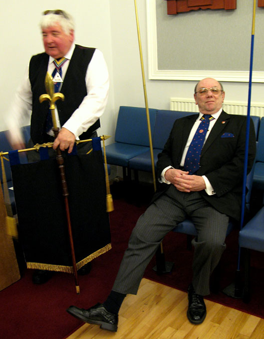 | Now it was time for the RW PGM Bro. Keith Alan Beardmore to enter the Lodge accompanied by Acting Grand and Provincial Grand Officers to enter, he was offered the Gavel by the WM which is his right of course and on this occasion he said he would accept it for a short time so as to introduce the members of the Prov Team and other distinguished officers to everyone at the meeting but he did say (wiping his brow) that he would be sure to vacate the chair in good time before the Advancement ceremony began. |