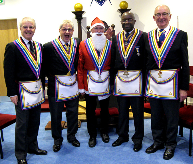 | Next there was that sound we hear around this time of the year a kind of “Jingle Bells”, I took a look through the spy hole and was astounded to see a man dressed in Red, now how did he get passed me!! yes you’ve guessed it, Santa, St Nicholas, the door opened and the Guardian said we have a slight problem, another Candidate who the WM has decided after a quick call to our PGM Keith must be elevated immediately due to the fact that he is extremely busy at this time of the year and will only probably be able to attend again next December, oh and here is the Form all filled in, proposed and Seconded, can you explain to the Candidate Bill that there will be a short delay, which I did. |
