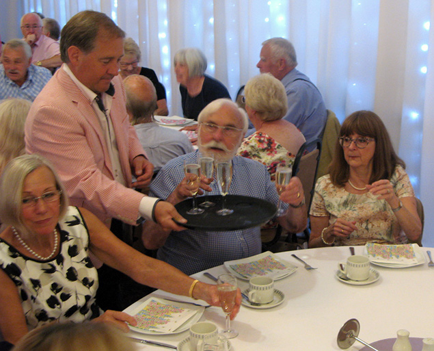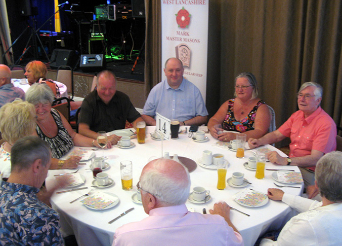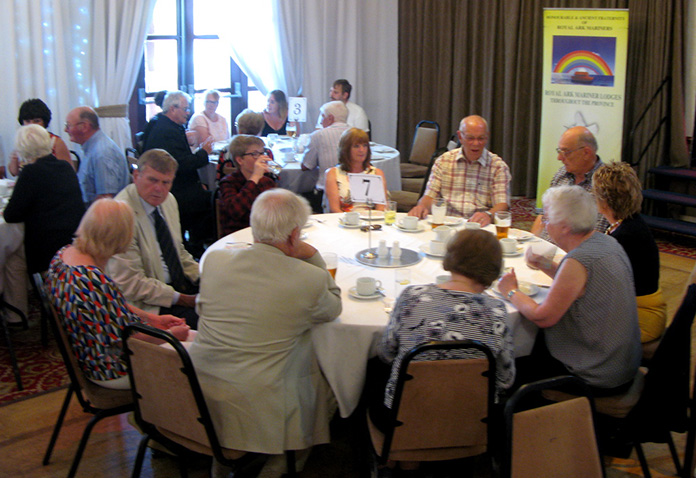 | As we in the Mark Degree have all come to expect there is always lots of genuine “Glad to see you again” greetings, friendly chat and news from all over the Province. Once everybody was comfortably seated and the Prosecco served to the tables by some temporary first class waiters, pyramid stands full of delicate cakes, sandwiches and delicious scones complete with clotted cream were brought round by the excellent members of staff at Leyland. |