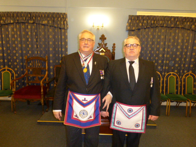 | WBro David Anderton, PGJD the lodge secretary read out the names before WBro Gaskell proclaimed Bro Mike Cunliffe Master Elect and WBro Fred Hulse, PPrStB treasurer, for the following year. During the first rising WBro Mike Winterbottom, PGSD and The PGM’s Special Representative for the Liverpool group of Mark Lodges presented Grand Lodge Certificates to Bro Tom Lunt and Bro David Aitken. |