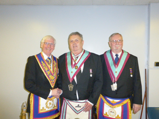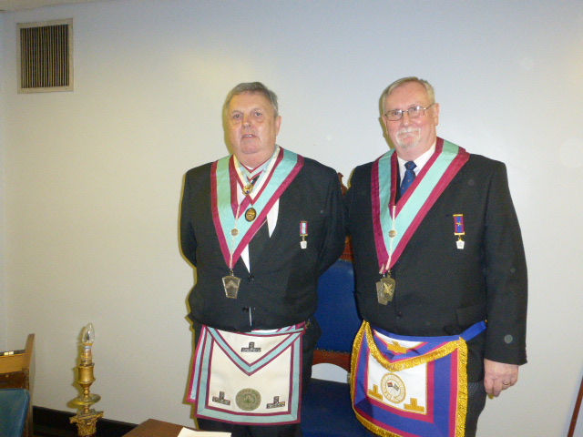 | The Worshipful Master, WBro Sandy Kean then performed a fine Installation ceremony, which was enjoyed by all those who attended. And the gifts kept on coming with an equally fine presentation of the Keystone Jewel done by WBro Derek Horrocks, PGSD, (Derek is one of the PGM’s Special Reps.). The Worshipful Master then installed his officers for the new season, which included the included the confirmation of WBro Steve McNee as Royal Ark Mariner Ambassador. |