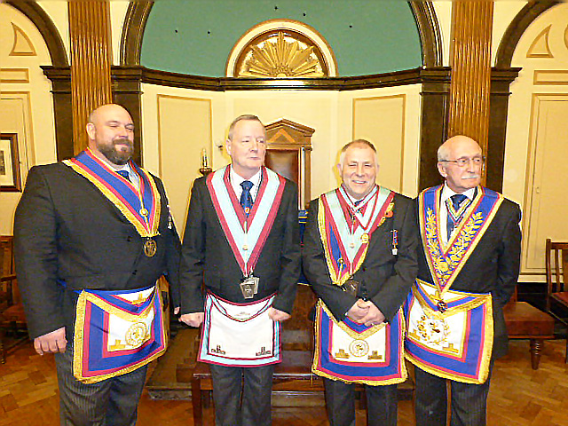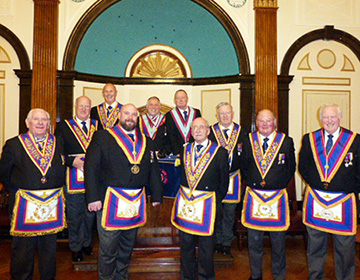 | Once everyone had drag themselves back down from the bar, the lodge DC WBro John Roberts, PProv GStB got everyone in place and found jobs for those who did not have one. WBro Eric Poole was standing in for the Worshipful Master and opened the lodge and completed the lodge business. Once this was done the DC retired to form the procession and on his return he announced that the Representative of the RW Provincial Grand Master sought admission. |