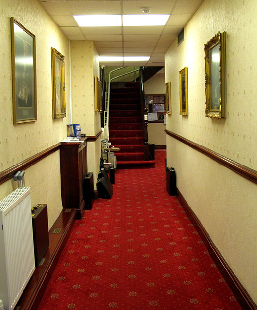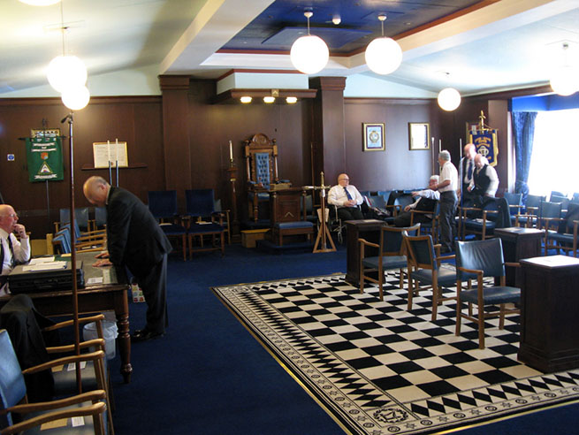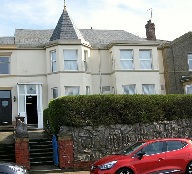 | From the outside there doesn’t seem to be anything special about the Hall its next but one to the end of a row of large terraced houses, however once inside I find it a delight, a warm friendly well kept building, on the ground floor there’s a bright hallway, an excellent dining room and separate cosy bar, two Lodge rooms and plenty of storage are located on the first floor, the stairway to them is complete with a chair lift for those who may need it. The main Lodge room is of a real good size with three carved Principal Chairs, a large table for the hard working Secretary and Treasurer, a first class floor carpet and framed miniature banners of all the Lodges who meet at Fleetwood. The other Lodge room is much smaller and looks more businesslike, there was a committee meeting taking place on this evening as it happened but it is more than capable of holding a reasonable sized Lodge meeting. All in all if you haven’t been to Fleetwood’s Hall it is well worth a visit. | |