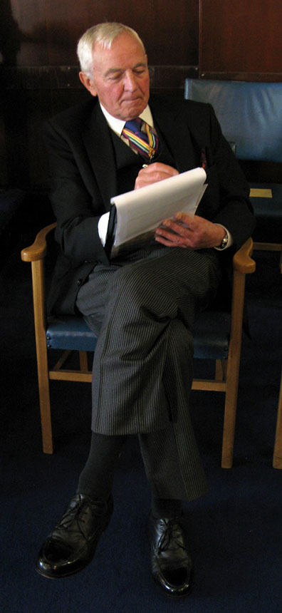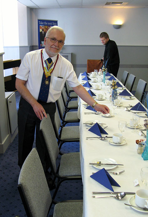 | Went to the hall to find the very hard working Jimmy Rogers helping to lay the tables for the Festive Board, he never stops! After dropping off my case went for a nice walk, well a nice limp due to the Op' I had last Thursday, into a very pleasant park close by called The Mount, I sat on a bench with a lovely view of the sea scape complete with a passing ferry, the birds were singing, the sun was out, if you didn’t know better you could be fooled into thinking we were going to have a summer. About half an hour later I spied the Provincial Tyler, Ernie Gavan climbing out of a van, now this I haven’t seen before but it made no difference he was soon unloading all the equipment which he cares for and transports to all the Team visits. | |