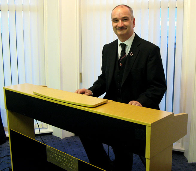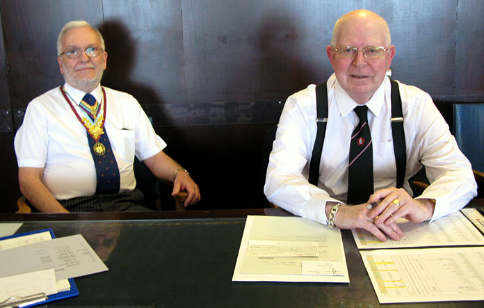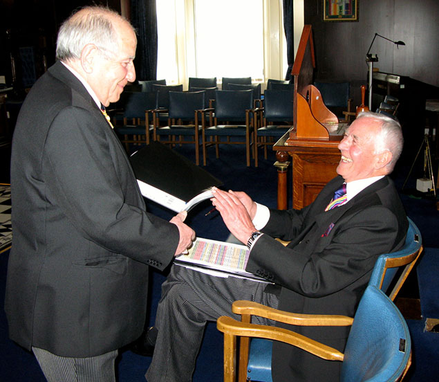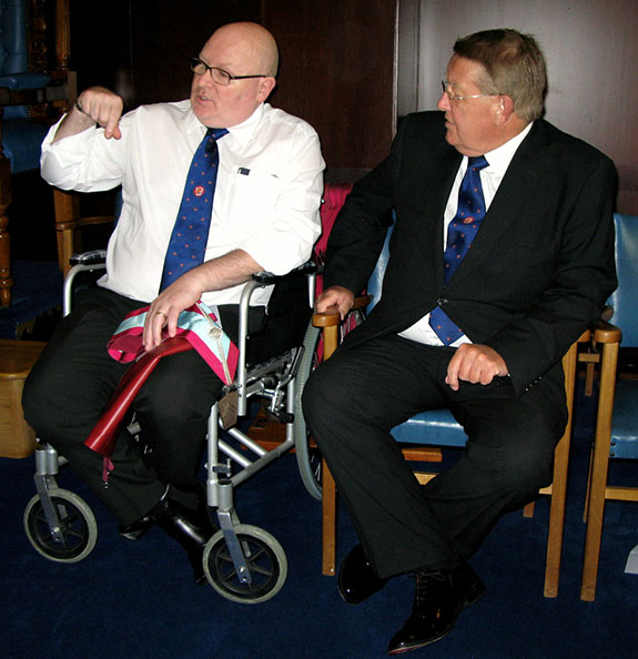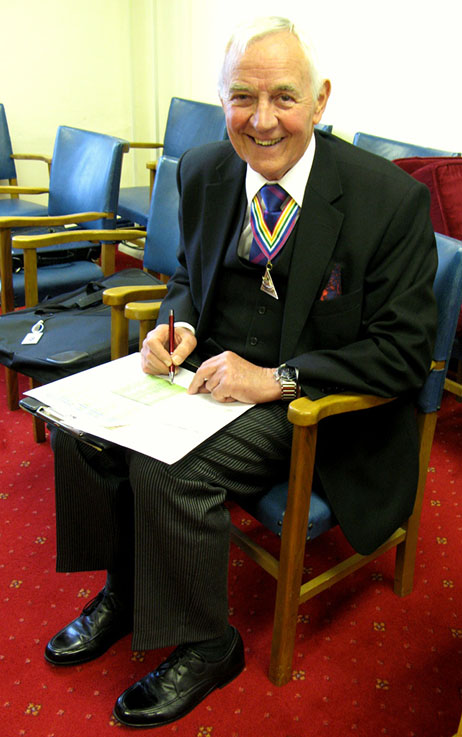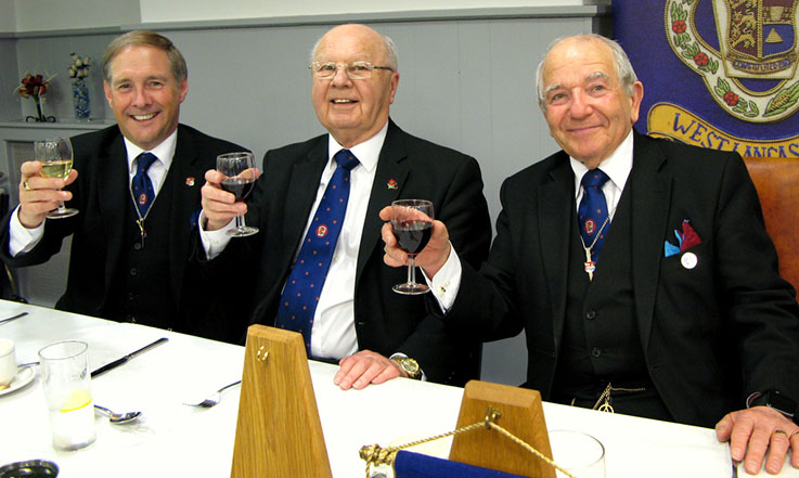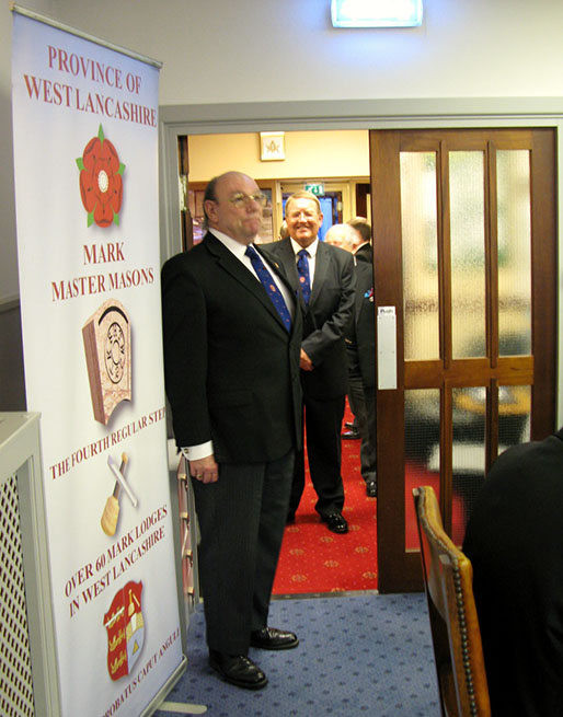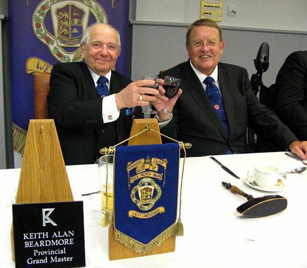 | The RW PGM Bro Keith Alan Beardmore then entered the Lodge accompanied by Acting Grand and Provincial Grand Officers, he was welcomed by the WM Bro. Joe O’Brien and as is his right he was offered the gavel which on this occasion he said he would accept for a short time so that he may introduce all the officers who had attended with him on this special occasion. On handing back the gavel (which he never likes to keep for too long) the WM thanked all the officers and members of his lodge for their support during the past year then went on to conduct an excellent Installation Ceremony and due to the special circumstances was assisted in fine style by W.Bro.Tony Blundell his good friend the WM from Cleveleys Mark Lodge, together Bro. David Britton the Master Elect was placed in the chair of Adoniram in a truly elegant manner and according to ancient traditions. The Keystone Jewel was presented and explained by VW Bro. Stephen Leach PGSO, the address to the WM was given by W.Bro. D. John Forster, the PGM’s Special Representative for the Fylde Coast. The officers for the coming year were then presented and invested, the address to the Wardens was given by the Prov Senior Warden, W.Bro. S. L. Boyd the address to the Overseers was given by the Prov Junior Warden W.Bro. V. H. Norris and last but not least the really lovely address to all present which I always find a delight was given by our RW.PGM Keith Beardmore who then proceeded to give his personal congratulations to the newly installed WM, who in turn was happy to present a cheque on behalf of the Lodge for the splendid sum of £300 for the West Lancs Mark Charity. | |