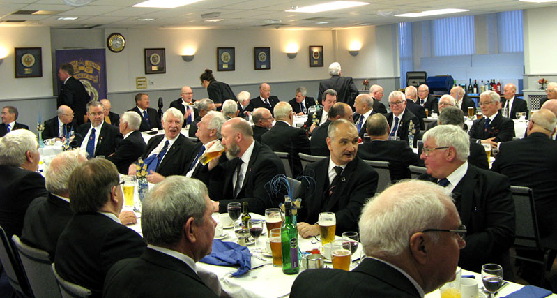 | Off we went to charge our glasses in the welcoming bar there was a great buzz in the air and happy chat about the Ceremony we had just witnessed, places were taken up in the dining room for the Festive Board, I was sat next to one of my favourite people the Prov Tyler Ernie Gavan who tonight was in fact unusually drinking lager, as everyone knows he transports all the hardware for the Prov Team Meetings and is usually driving, not tonight his good friend had brought him in what Ernie described a very strange yellow van, you just can’t help some people, it was all in good fun. | |