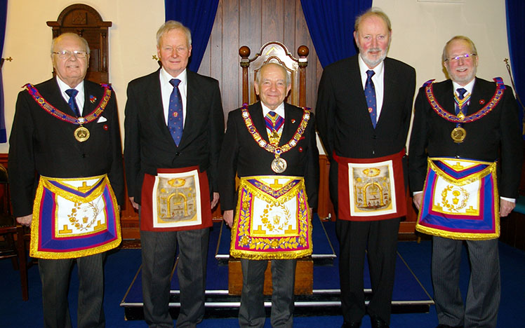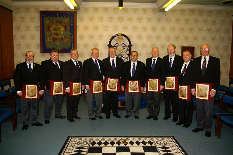 The Lodge was opened at 6pm and the Lodge business was conducted by the W.M.Bro David Hatchard. W.Bro David Emerson announced that the Provincial Grand Master R.W. Keith Alan Beardmore stood without and demanded admission. The PGM entered accompanied by Grand and Acting Provincial Grand Officers. The W.M. Bro. David Hatchard offered the PGM the gavel which was quickly returned so he could enjoy the proceedings. |