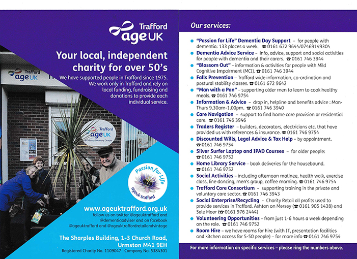 The local Dementia hub in Urmston is provided through the AGE UK Charity headed by Ann Marie Jones, Chief Executive, with over 90 volunteers and 26 employees. Their work is essentially summed up in the attached leaflet and day care support is provided for people with moderate to severe dementia 5 days a week in the form of 133 places including a two course hot meal. |