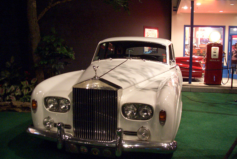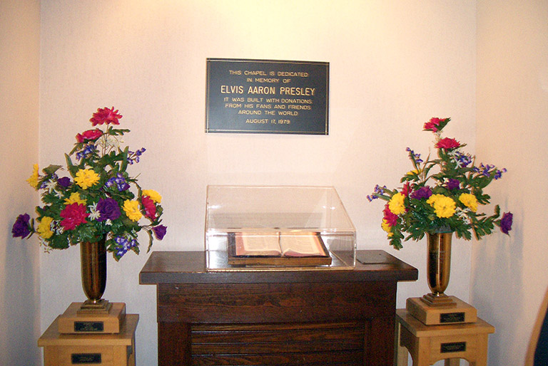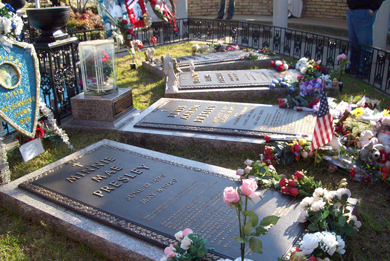 After carefully crossing the road we went through the gates just inside was a gatehouse complete with a guard, we asked what was happening, he told us that in the early hours each day the fans are allowed to pay their respects at the graveside, just follow the road to the right and you will come to the meditation garden where the graves can be found. We walked slowly up the winding road and were greeted by a wonderful site, lots of colourful flower tributes, pictures and mementoes which had been left by fans from all over the world. It was truly moving, then in the silence suddenly I could hear Elvis singing, his voice was being carried on the breeze from the Heartbreak Hotel across the road, it was really spooky. Eventually we made or way back to the hotel and went into the dining room for breakfast, lots of food was laid out continental style including lots of fresh fruit I did notice however that lots of visitors were eating waffles, now where did they get them from? On looking around I spotted a machine which was obviously where you made your own, never done that before but it didn’t take too long to work it, now were talking, fill up the squares with honey and off you go. |