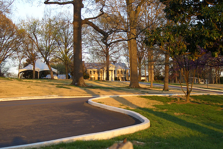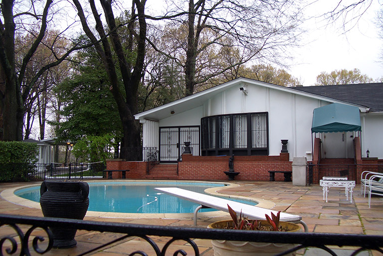 Considering that Elvis was known the world over you could say that Graceland is quite a modest building and as for the land it stands on you can see all the white fences which completely surround it at the back so really it’s not that big, there is a swimming pool but there again it’s quite small. |