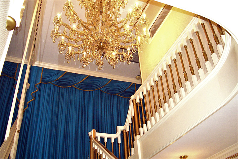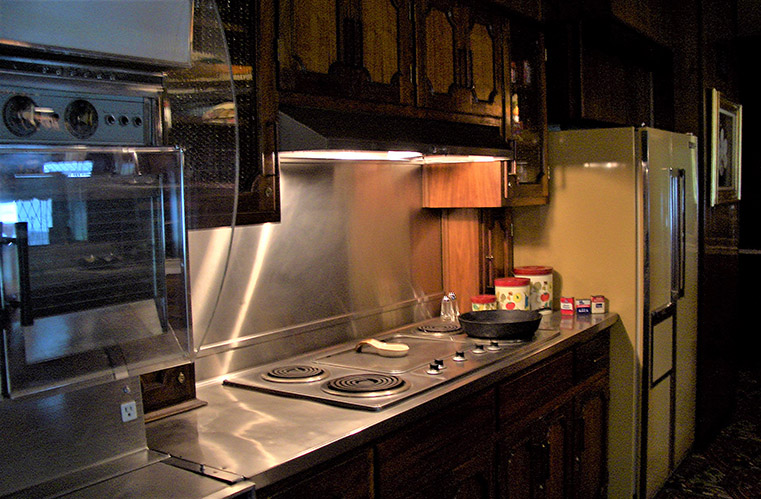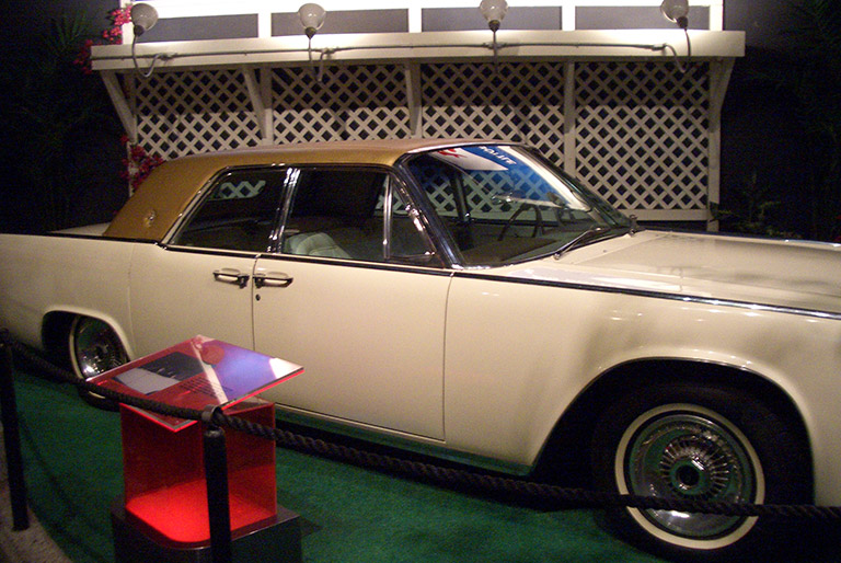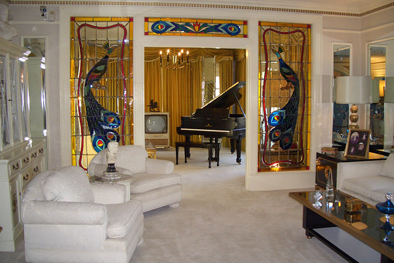 A little while later we got ready and made our way to the check in point for a tour of Graceland, you climb aboard a small mini bus and given a set of headphones then you are taken across the boulevard and in through the gates, the sound of Elvis is playing in your ears singing “Welcome To My World”, you drive right up to the front door of the house and invited to take as much time as you want to take photographs. Once you have your photo’s you are invited inside and first shown the lounge area with the special seating ordered from Memphis, the Peacock stained glass panels and at the far end the Grand Piano where Elvis spent many hours playing. On the right in the hallway alongside the impressive stairway is his mother Glady’s bedroom it can be seen exactly as it was when she was alive. The general public are still not allowed in the upstairs area where Elvis died, turning left in the hallway is the dining room which again is set up just as it was when the King was there, it was a tradition that he, Priscilla, Lisa Maria his father Vernon and a few close members of his staff would always sit around the table for evening meals. Next door on the left is the kitchen where everything was prepared by Mary Langston who had been with Elvis for many years, over a 14 year period he bought her four cars and a three bedroomed house amongst other things and would be on call quite often for twenty-four hours a day!! Elvis began to eat in King-size portions over the years, cheeseburgers, chicken-fried steaks, hamburgers, caramel cakes, banana pudding and fried peanut and banana sandwiches. For breakfast he’d have homemade biscuits fried in butter, sausage patties, four scrambled eggs and fried bacon. Whenever he had a stay in hospital and on a strict diet she would sneak in bags of Hot Dogs and sauerkraut, not really a help to his health of course. A little further on and down a few steps on the right you are faced with a black and yellow television room (décor of the time the 70’s), complete with a small bar (nothing alcoholic) and four television sets, just like me he could watch a few programmes at the same time and know exactly what was going on in each of them. |
