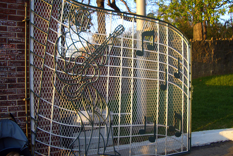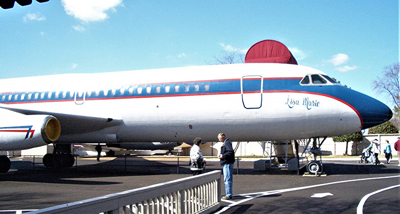 We checked in and the bags were taken to our room, inside was a King size bed, a small kitchen and a lounge area complete with TV, sofa and easy chairs, we settled down and chilled out for the rest of the evening, the TV besides normal viewing had several channels which showed nothing but Elvis films none stop, well what did you expect. Bright and early the next morning at 7am we were up, excited and looking forward to the day ahead, on looking out of the windows we kept seeing small numbers of people passing by, tried to see where they were going but all we could see in the distance was the tail fin on the “Lisa Marie” Elvis’s plane. Well we thought let’s go and see, they must be going somewhere, outside it was a wee bit chilly but the sun was shining in a crystal blue, (which I have never forgotten) before too long a couple went bye so yes we followed, over a little bridge across a small car park and in about five minutes we were on Elvis Presley Boulevard opposite the World Famous Musical Notes Gates of Graceland, wow. |