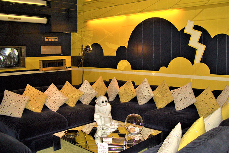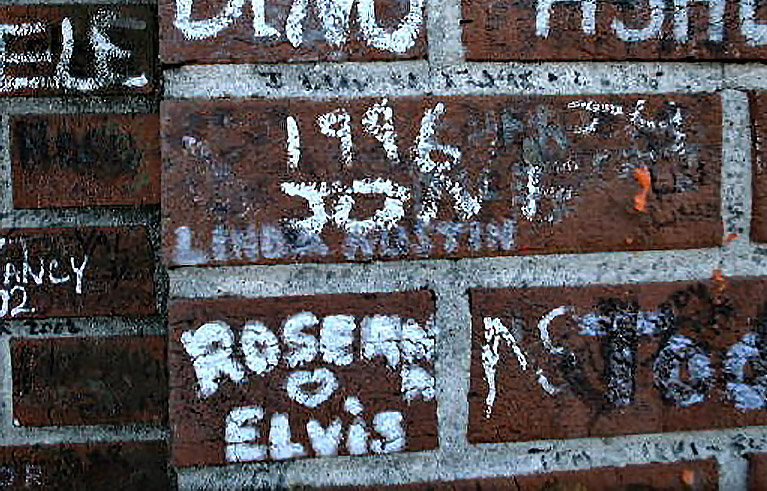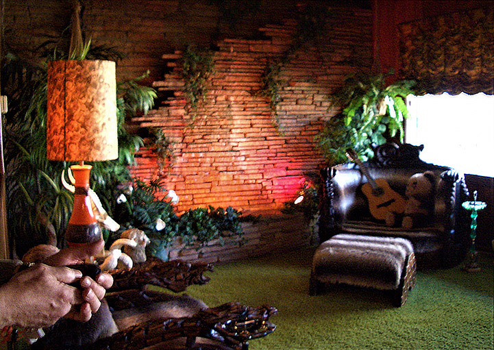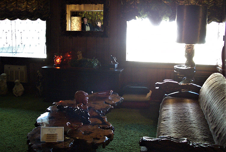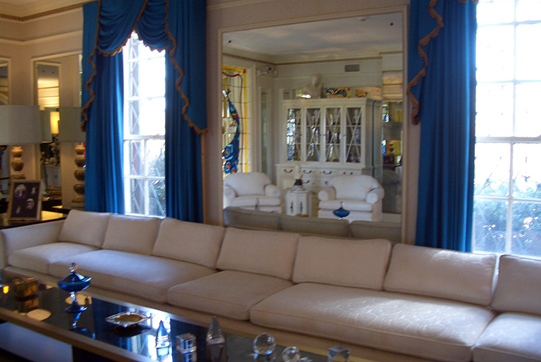 Opposite the TV room is a plush room which contains a pool table, all the walls and ceiling are covered with yards and yards of folded fabric, most unusual to say the least. I think the pictures will give you more idea as to what Graceland was really like but I must mention one more room which is just off the pool table room and that is the famous “Jungle Room” where in his later years when the studio had trouble getting him to go and record they would bring a big mobile recording studio to Graceland (known as the Big Red Truck) and park it at the back of the house next to the Jungle Room with all the cables going through the window, I have some recordings done at the time where they are running through songs and a dog starts barking, on others a phone starts to ring, you hear Elvis say “shoot the yellow dog” (it was called Getlow) on another he says “shoot the phone off the wall”. The room contains a water fall at one end running down an uneven stone wall, the furniture is very strange, apparently Elvis father Vernon came back from a visit to Memphis and said to his son “man I’ve just seen the weirdest furniture”, that was all it took, it all arrived the next day! |