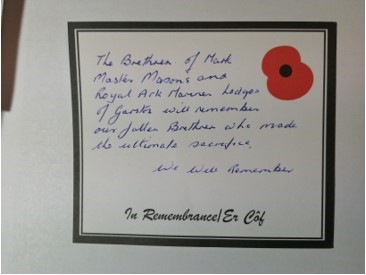 Sadly, this year due to the Covid pandemic and instructions and guidelines issued by H.M Government, Grand and Provincial Grand Lodge of Mark Master Masons, the usual Remembrance services and respects are curtailed throughout the country.