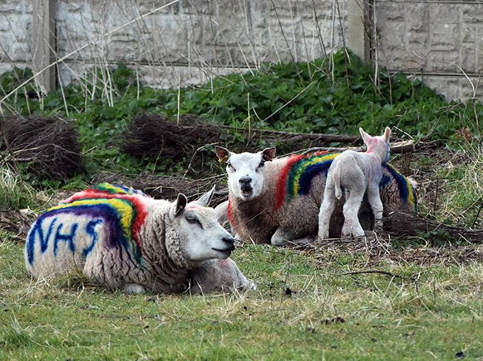There was no danger to the ovine beasts as the dye used was of the type which is in general use for marking them. The lambs with their mothers had not been decorated as no doubt it would have been impossible to keep them still for long enough. I do not know who was responsible but he had provided a useful clue in painting his initials under his work – NHS. |