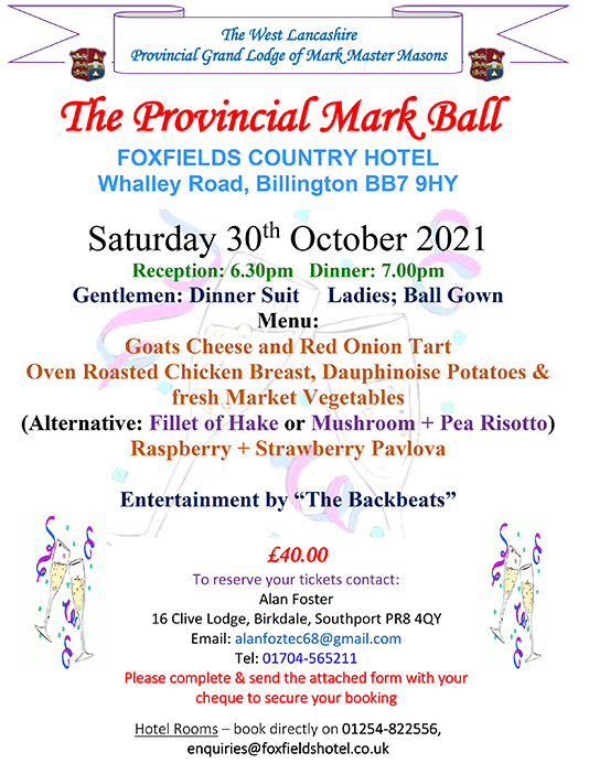 Brethren, on behalf of the Right Worshipful Provincial Grand Master and his Executive team, I cordially invite you to attend the Provincial Mark Ball on Saturday 30th October.  The Ball will be held at the Foxfields Country Hotel, Whalley Road, Billington, BB7 9HY, with reception at 6.30pm and dinner commencing at 7pm.