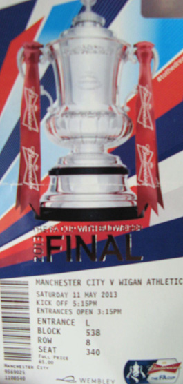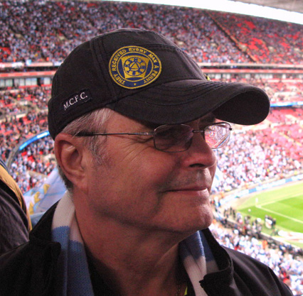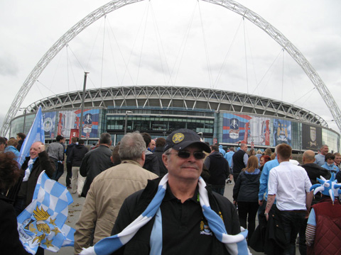 All aboard, off we set again with our new driver George, the traffic was reasonable and there was no rain as yet, you could tell we were getting close to Wembley when all the houses started to look run down and semi derelict, if you’ve had the pleasure yourself of going to the National Stadium you’ll know what I mean. Now the fun begins on being directed by a brigade of yellow coats we finally entered a coach car park only to find it was for Wigan busses, oops. Some 20 minutes later and after turning the bus round on three occasions in single lane roads we entered another coach park, success; it was the Man City coach park. We were stuffed in a corner and the thought quickly came over me that we would be one of the last out !! (This proved correct) | ![]() |
