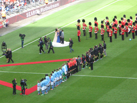 Made our way to our seats, good view, flags on every seat just right for getting poked in the eye, still the thought was there. The centre tier as usual which are the best seats in the stadium were full on non supporters as can be seen by the lack of colours, they are Wembley Club ticket holders seats, the ones who are still in the bar 20 minutes after the second half kicks off and generally don’t even have a clue who is playing !! | |