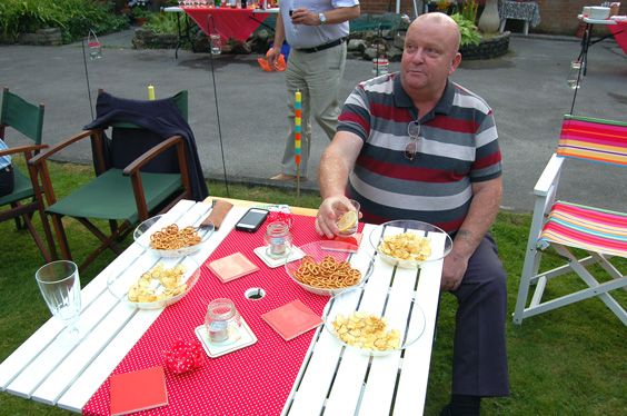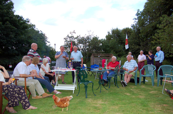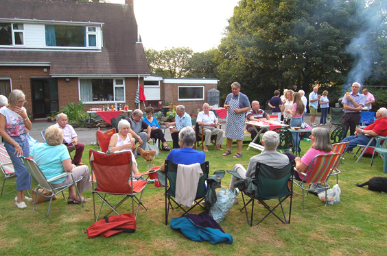 The day had been very pleasant with warn sunshine, and as those attending arrived it was a fine evening with the sun shining down and all gathered on the lawn whilst Rev'd Adrian Arnold slaved over the hot barbecue. | |