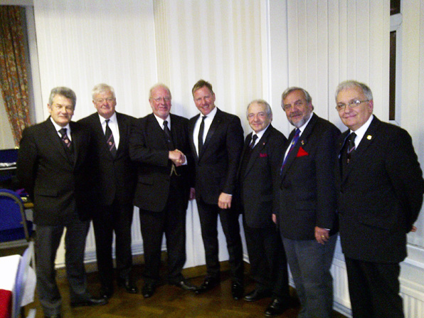 Bro Martin being congratulated by the W.M. along with the Dep P.G.M. Keith Beardmore, Special Rep John | |||