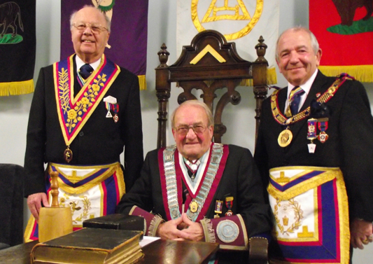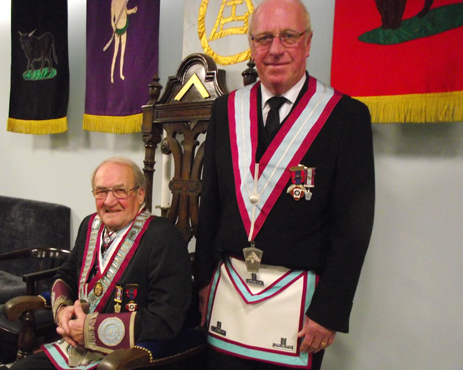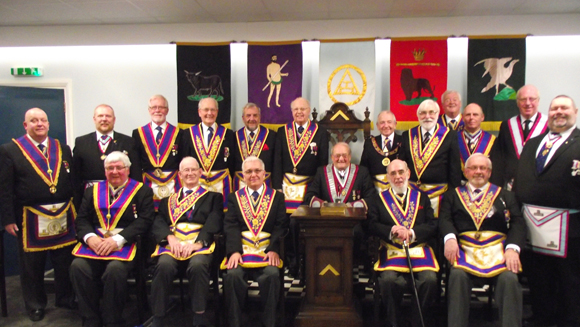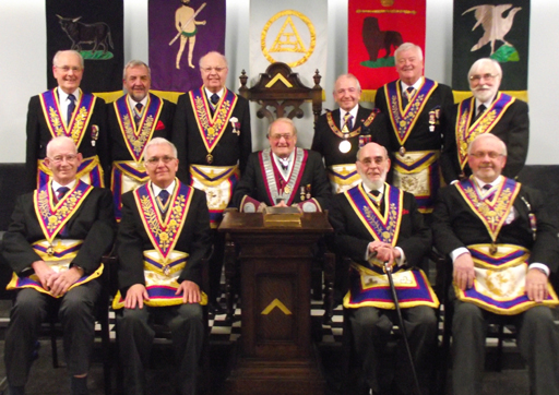 Provincial Grand Secretary Geoffrey Lee represented PrGM Peter Connolly. He in turn was accompanied by DepPrGM Keith Beardmore in a procession of eight grand and acting officers who attended to witness a polished performance enacted by outgoing WM Rory Maskell who was ably assisted by the officers of the lodge as he installed his successor. | |