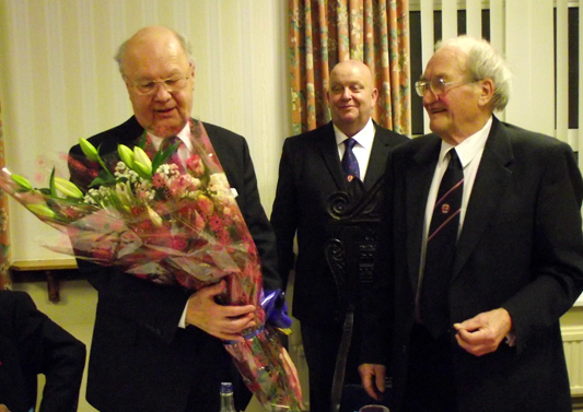 Geoffrey Lee receives a bouquet for Mrs Lee from George Wright as David Bell looks on |