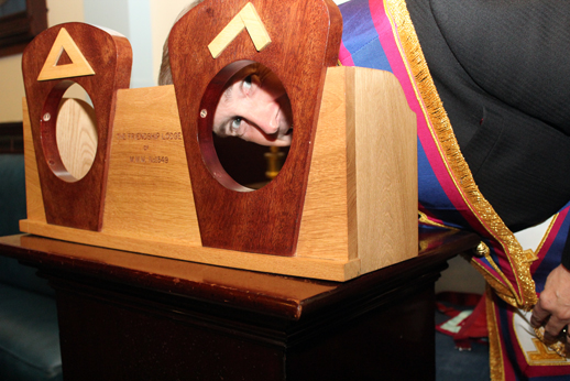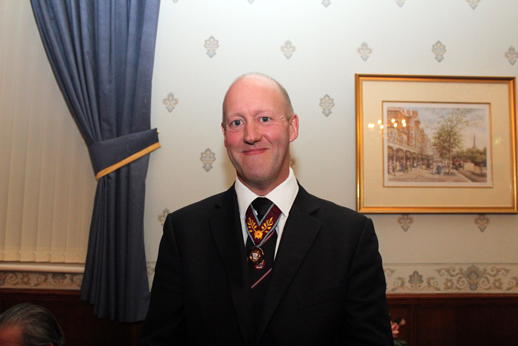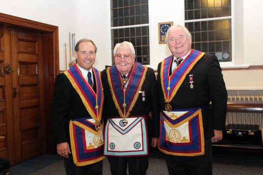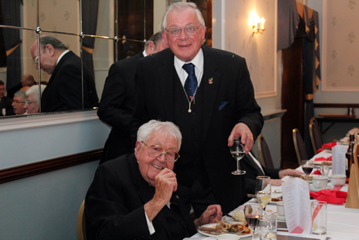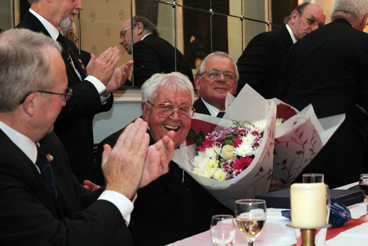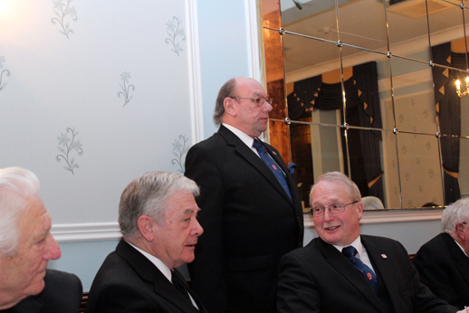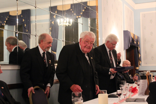 Harold was at times apparently a little emotional at the memories which came flooding back, but was visibly shocked when the PGM stood, commanded his Provincial Wardens Giles Berkley and Peter Hegarty to stand, and opened Provincial Grand Lodge! The Lodge was in stunned silence as Peter Connolly appointed Bro Harold Ford to the rank of Past Provincial Assistant Grand Standard Bearer, at which the tension broke, and the whole audience burst forth with a huge round of applause. The meeting was graced with the presence of 5 Craft Masons, there to support their friend Harold, but we didn't tell them any of our signs or secrets... | |