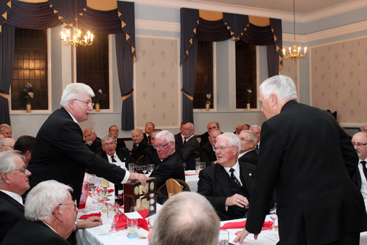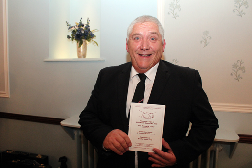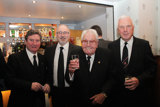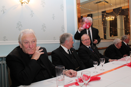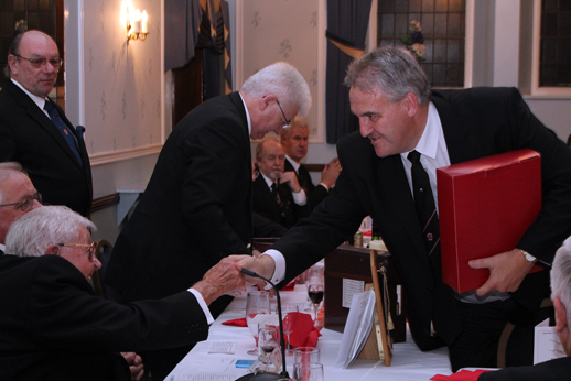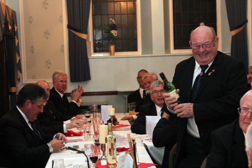 The assembled crowd were treated to a West Houghton raffle performed by Peter Hegarty, which raised a goodly sum of money, and a place card raffle for which our celebrant had kindly donated a nice set of 3 fine wines, naturally won by Andy Whittle. Bob Hall swept away the soap and perfume prize for Carol, and Deputy Sword Bearer Steve Clarke, who acted on the night, won some wine, which he resolutely refused to open in the car on the way back to Cleveleys, as he gave me a lift home. Never mind. The party continued in the bar afterwards, and we will all long remember this wonderful celebration. |