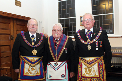 Naturally, to mark such an important milestone, the Provincial Grand Master Peter Connolly, Deputy PGM Keith Beardmore and Assistant PGM Ian Nairn, along with the whole Provincial Team (27 in number) were in attendance. David Emmerson Prov. DC, assisted by Ray Pye, soon whipped the acting officers into shape for procession and recession, and told us all where to stand. Harold was excited, but also a little nervous before the meeting, but Peter Connolly soon put him at ease with a light-hearted recital of Harold's Masonic career, much of which has been carried out in the Middle East. | |