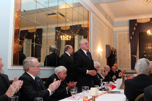 It was then my turn to propose the toast to my friend Harold Hall. It is never an easy thing to follow our PGM, but I did my best, speaking from the heart about a truly caring Mason, who has served as Almoner for his Craft Lodge, Neptune (my father's Lodge), for 26 years! He has also looked after my mum for 40 years, since my father passed to higher service. I asked the audience if they knew of any other organisation, or person, who looks after the widow of a former member for 40 years? Well, Freemasonry does, and Harold Ford does! He was applauded loudly, and we all stood to honour the toast to our celebrant. Harold then spoke eloquently and fascinatingly about his work in the Middle East, working for the big oil companies, transporting the gathered brethren to the 60s and 70s in a land of opulence and hard times in equal measure. He finished his speech to a standing ovation, and wine served to seal our toast to him. |