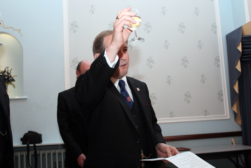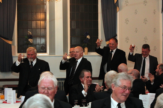 The recession from the Lodge led smoothly to a very noisy and happy festive board, with everyone clearly enjoying themselves tremendously. Ian Nairn, Asst.PGM spoke for the Grand officers, and then proposed the toast to the PGM, who stood and spoke with his usual consummate ability and skill. | |