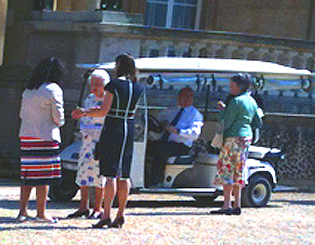 As can be seen from the photograph they also used a six seat buggy which Golf Buggy Hire were proud to provide together with other vehicles for the use of the guests. Michael did offer to drive the buggy; the driver, however, was in fact a member of the royal household staff. Maybe that was fortunate as driving was very difficult with people milling around and Michael would not have wanted to be responsible for any potential accident with such distinguished passengers on board! | |