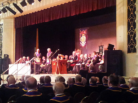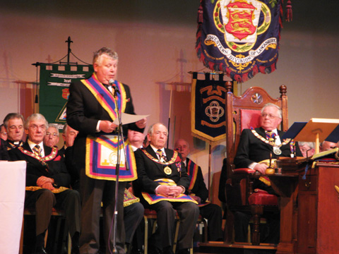 The PGM delivers his report to the brethren following which he invested and promoted a total of 106 brethren to Provincial and Past Provincial Grand Rank. Following which he addressed to assembly on the presence of the Grand Secretary designate, VW.Bro. Paul Tarrant, Who took the opportunity to respond. He was given a traditional and well deserved West Lancashire response. | |